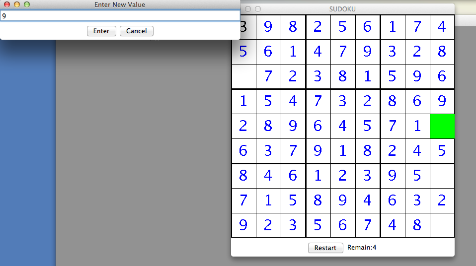 - If the number entered in the dialog box is correct (i.e. it matches the number in the Sudoku solution for that cell) then the number must be filled in the cell. The