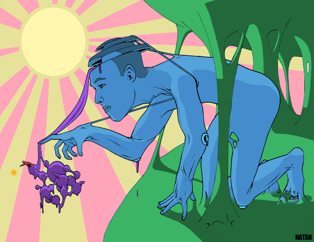 Self-portrait, Ink on paper with computer colouring, Natan, Feb 2007, age 16.